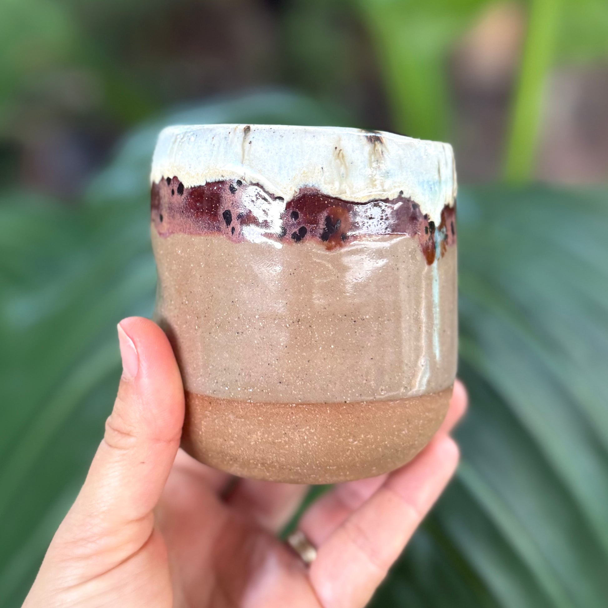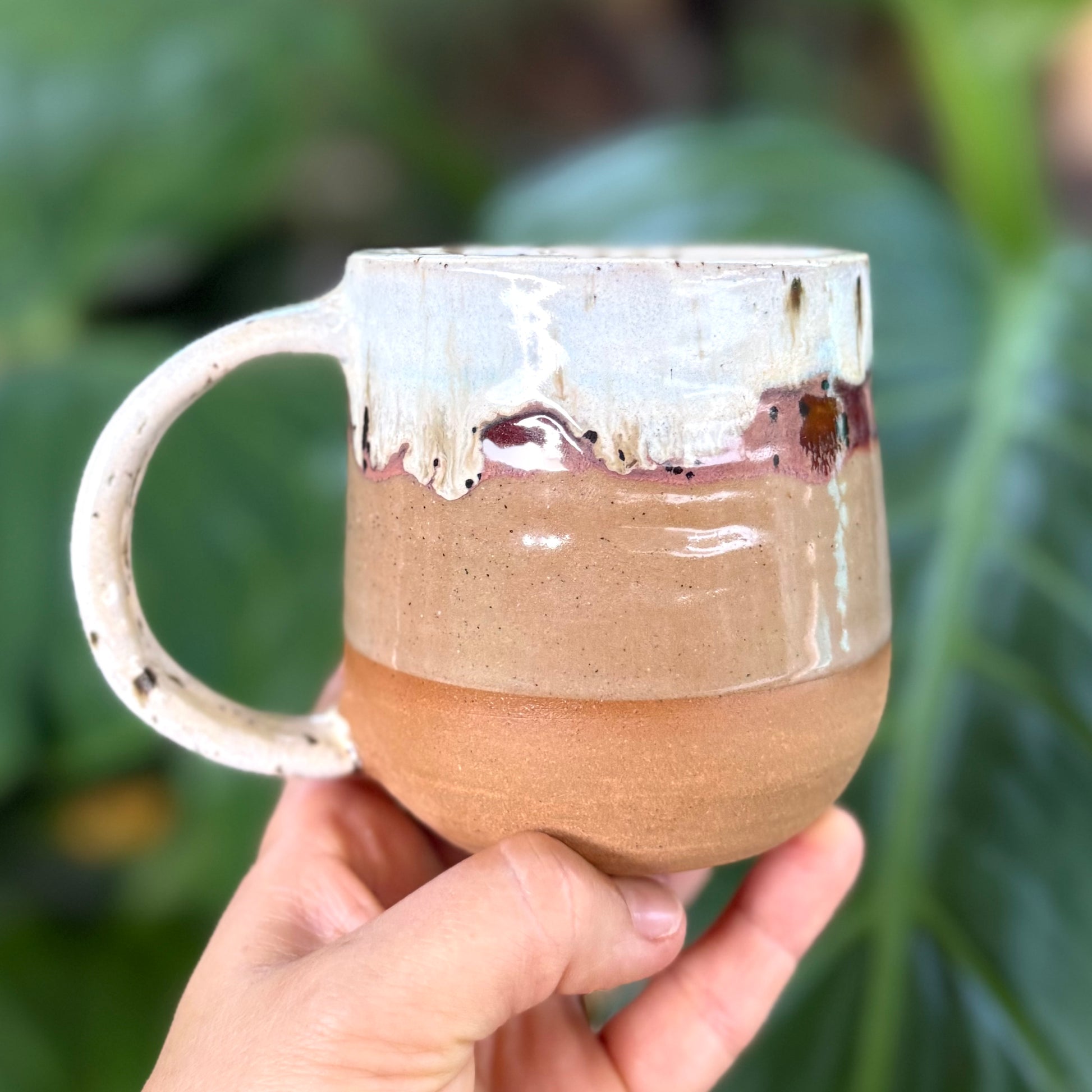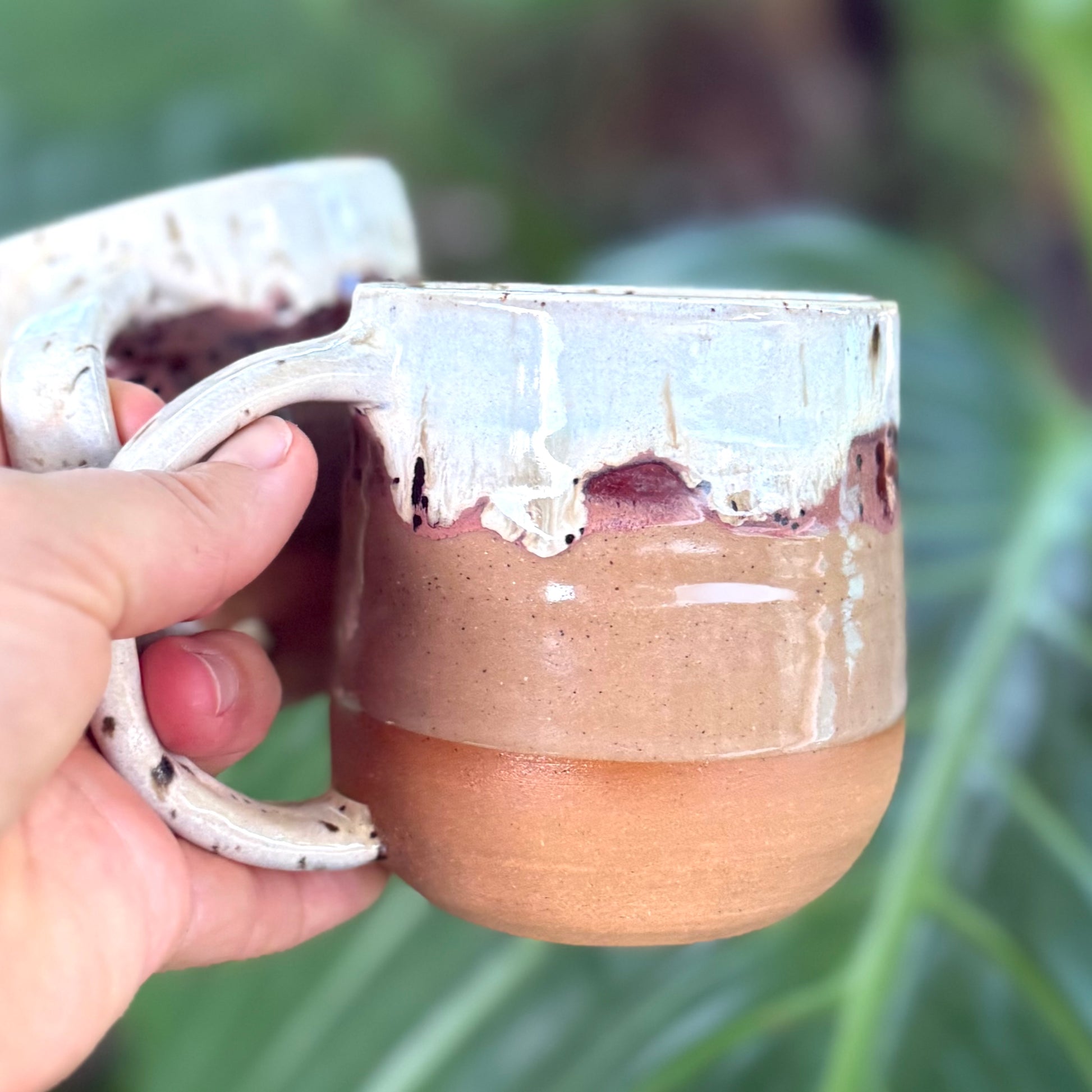 Each piece is hand-thrown on the wheel, glazed by hand, and fired with care in Noosa, QLD. Made in small batches, every mug and travel cup is unique — slight variations in size, glaze movement, and speckling reflect the character of handmade pottery.